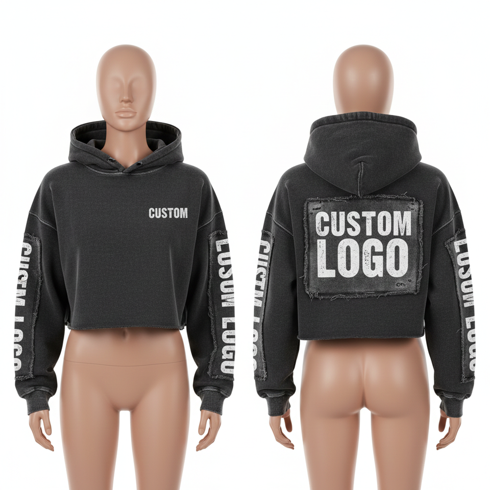 Custom Logo 100% Cotton Raw Hem Cropped Pullover Hoodie Distressed Ptach Embroidery Crop Raw Hem Hoodies 2026