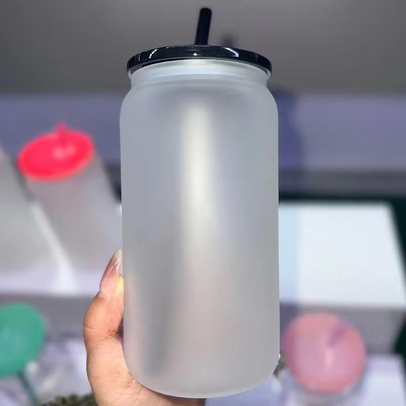 Custom Logo 16oz Frosted Clear Glass Tumbler Cups Jars Sublimated for Beer Juice & Drink Use with Colored Lids and Straw