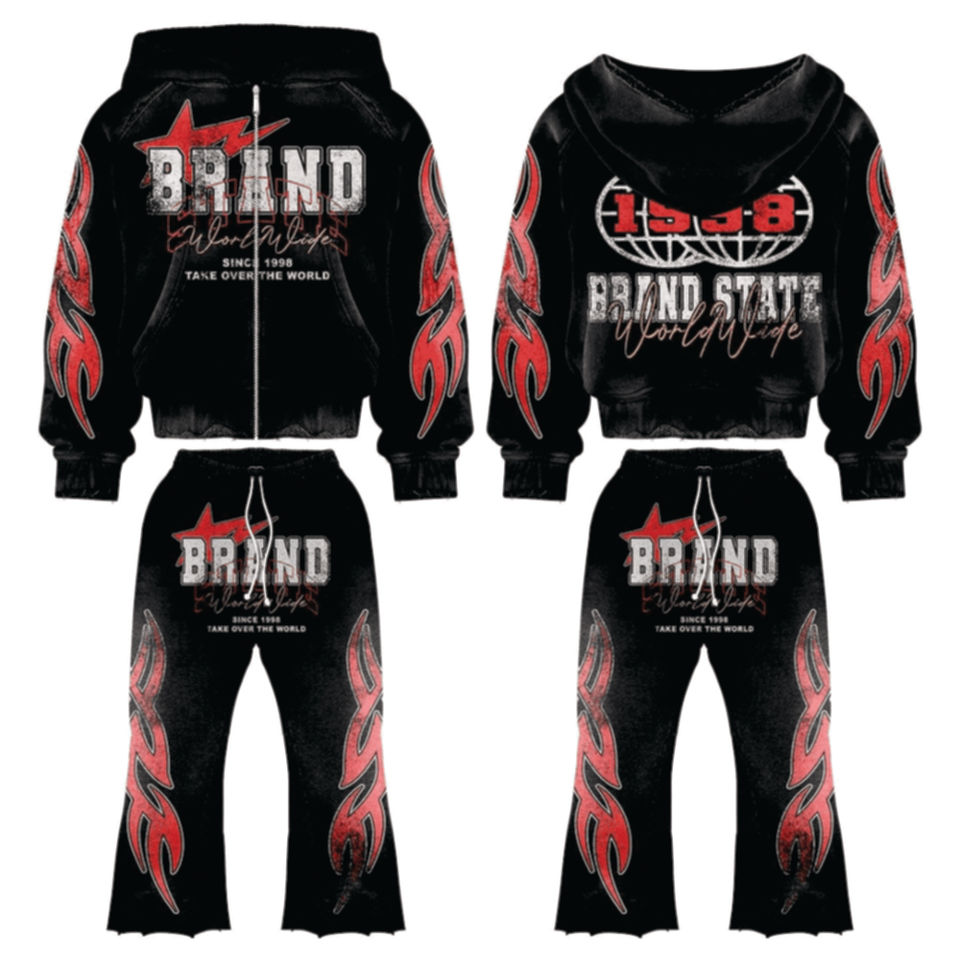 Custom Logo 2-PC Set Breathable Business Sweat Suit Tracksuit Oversized Plus Size Cropped Hoodie Wide Leg Pant Distressed 100%