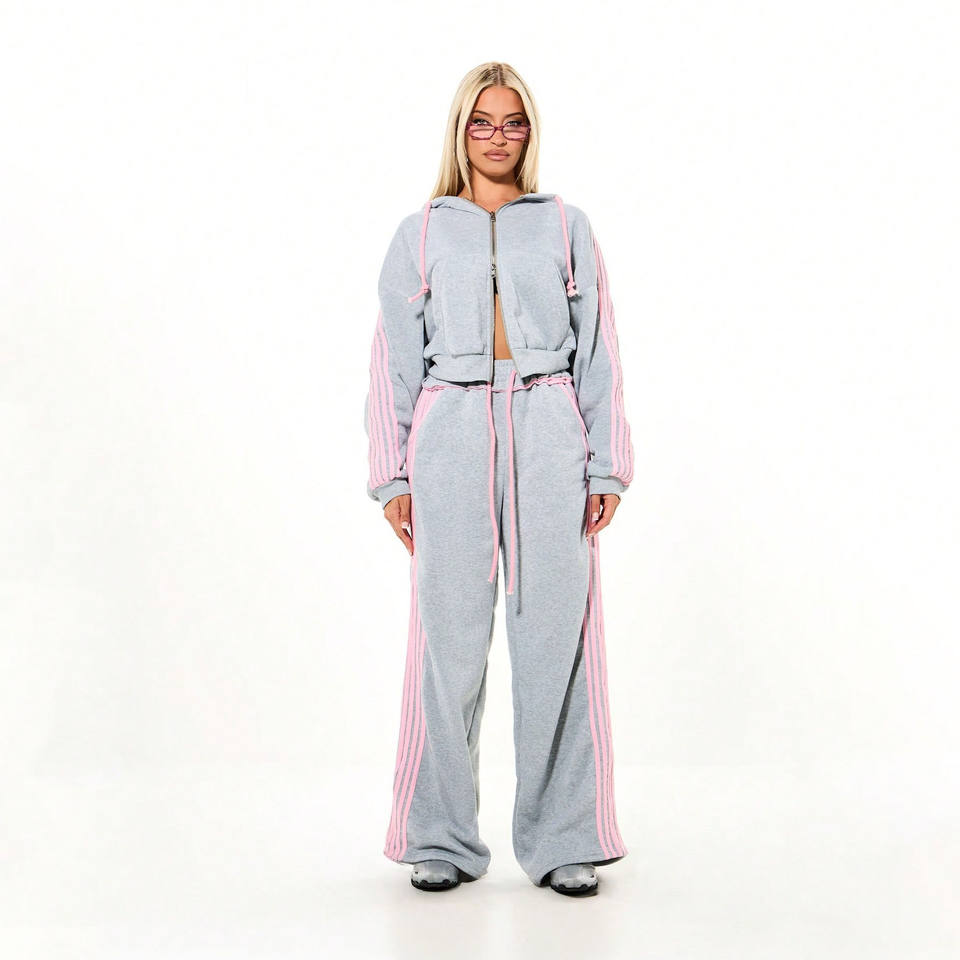 Custom Logo 2 Piece Embroidery Oversize Boxy Fit Fleece Hoodie Women's Crop Zip-Up Sweatsuit 100% Cotton With Side Stripes