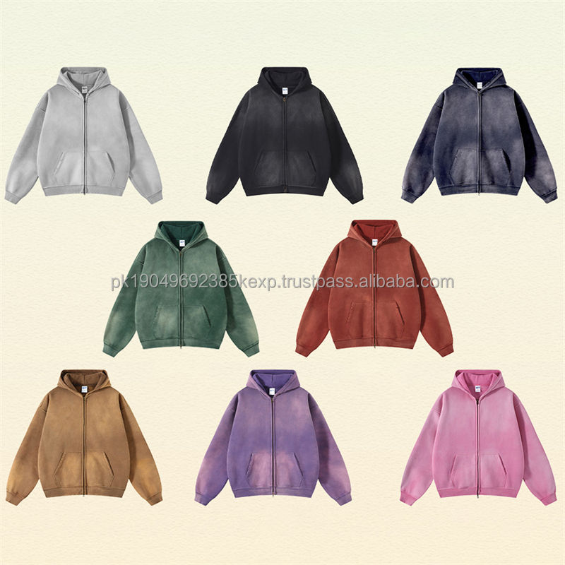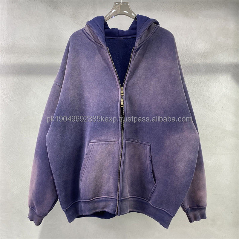 Custom Logo 360GSM High Quality Men's Zipper Hoodies Hooded Fleece Acid Wash Distressed Hip Hop Hoodies Men Retro Streetwear
