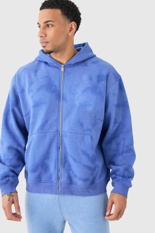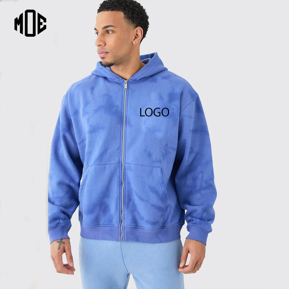 Custom Logo Acid Wash Tie Dye Plus Size Tall Men Zipper Hoodies Men Breathable 100% Cotton Blue Ribbed Bottom