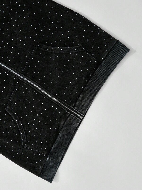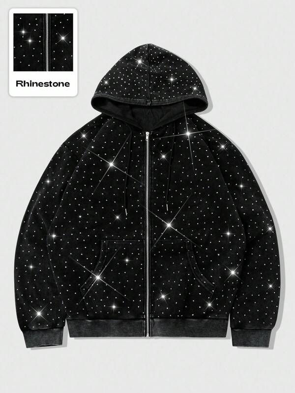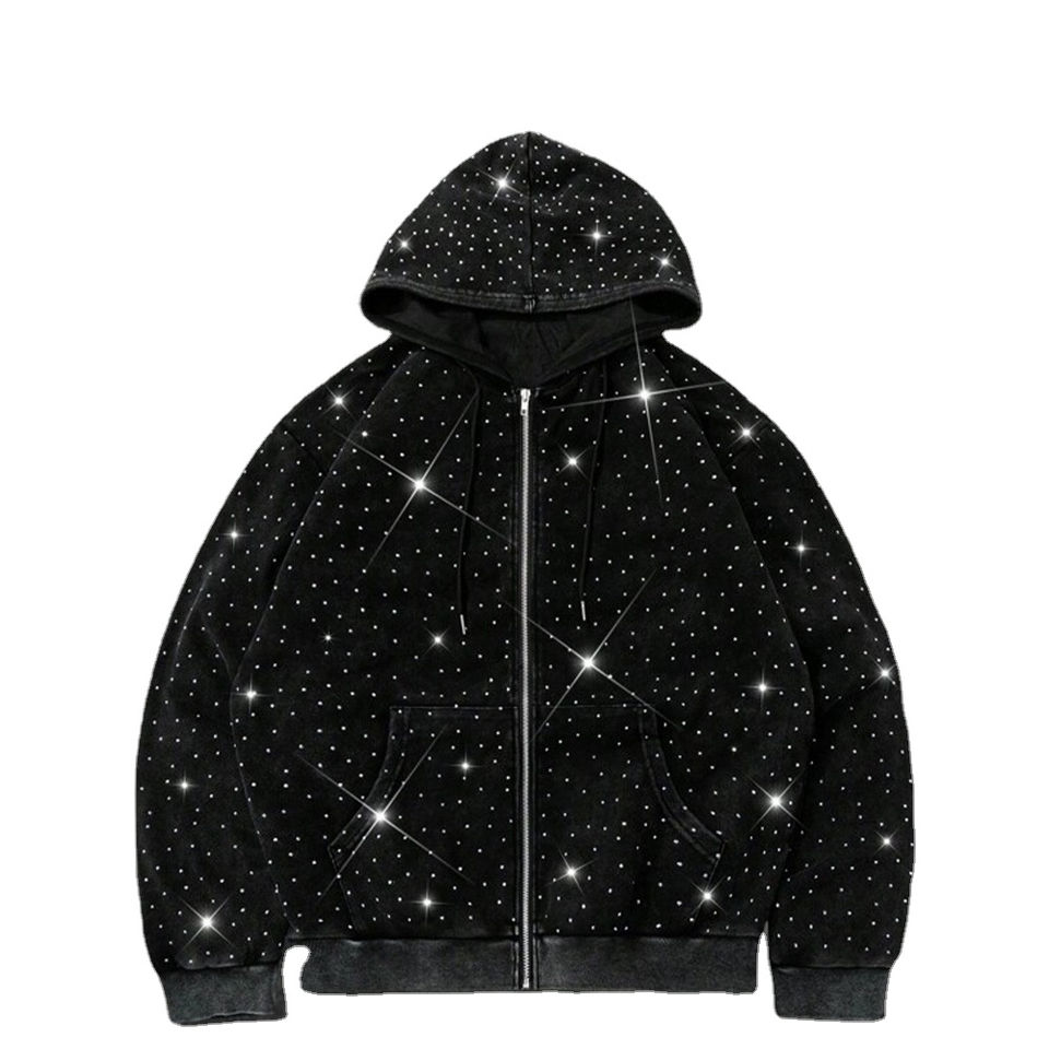 Custom Logo All Over Rhinestone Zip Hoodies Sparkle Crystal Studded Oversized Fit Streetwear Fleece Cotton Jacket Men ODM Autumn