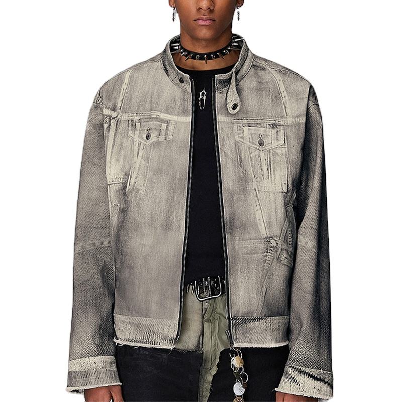 Custom Logo Antique Men's Casual Vintage Distressed Washed Print White Graffiti Denim Jacket High Quality Work Button Embroidery