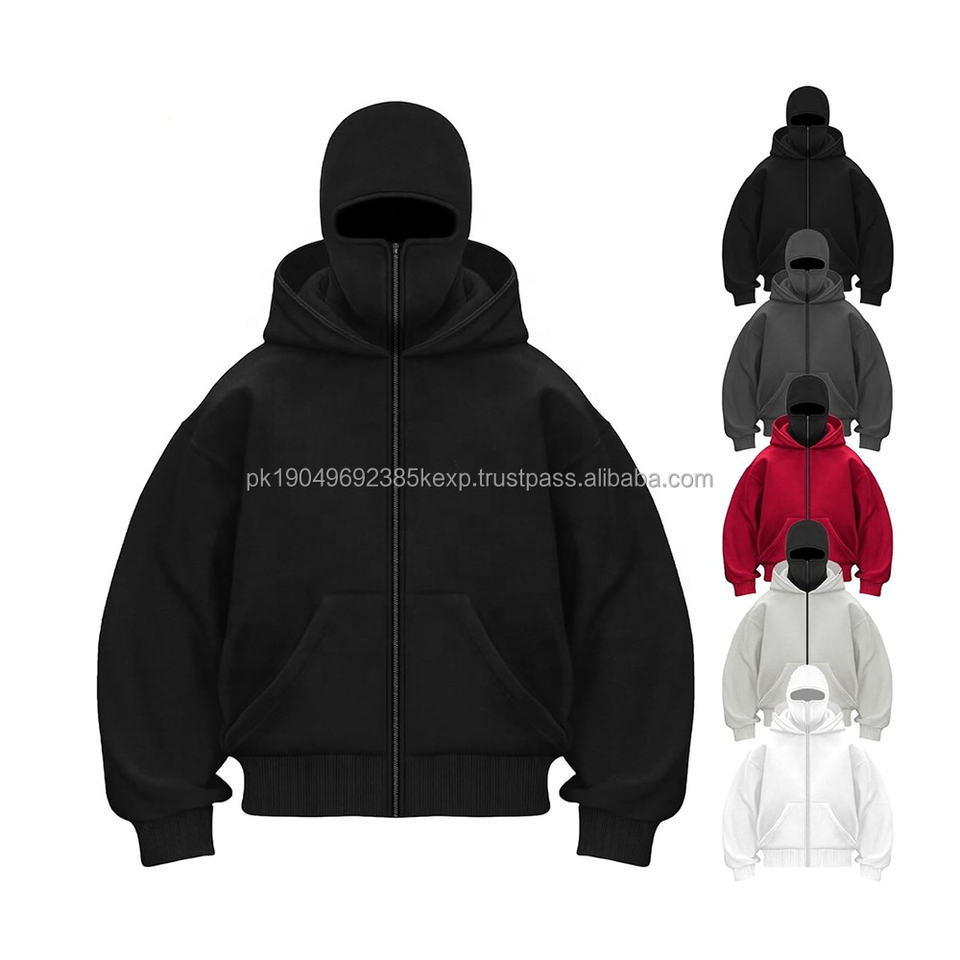 Custom Logo Black Balaclava Hoodie Double Hooded Ninja Full Zip Plus Size Heavyweight Double Layer Embroidered Technique