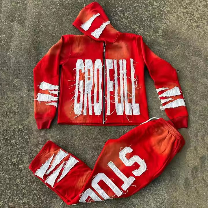 Custom Logo Breathable Winter Solid Streetwear Acid Wash Flared Tracksuit Mens 100% Cotton Distressed Embroidery Applique
