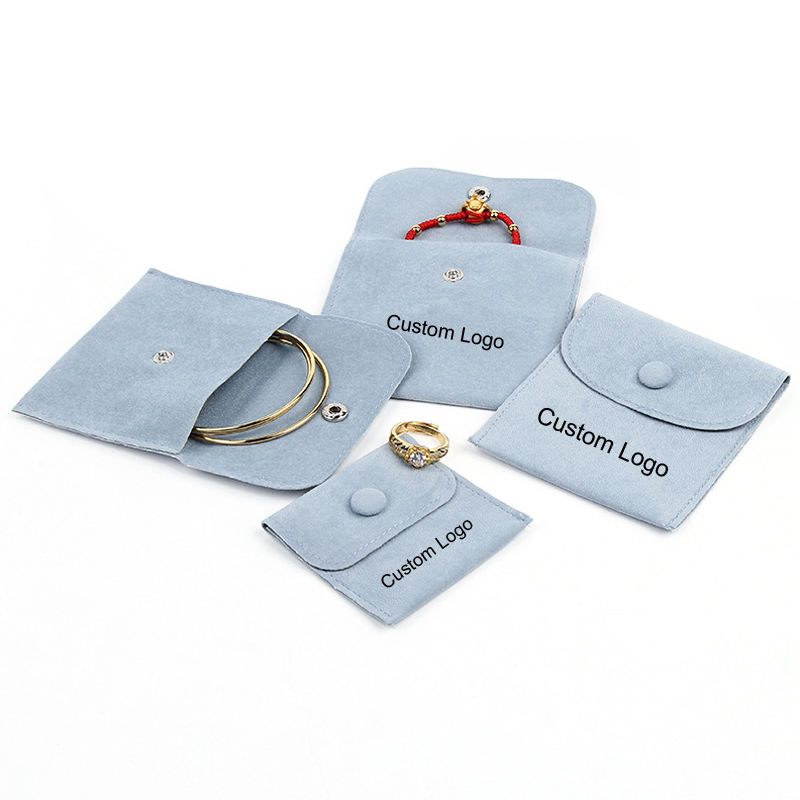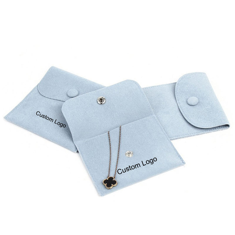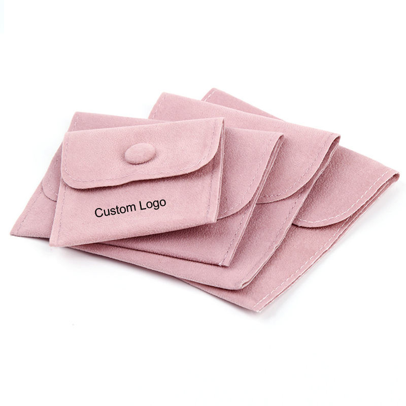 Custom Logo Button Closure Flat Suede Velvet Recyclable Handmade Jewelry Packaging Pouch Pink Pocket Envelope Gift Bag Necklaces