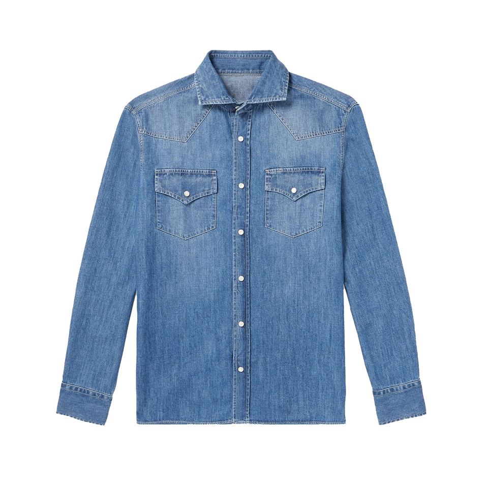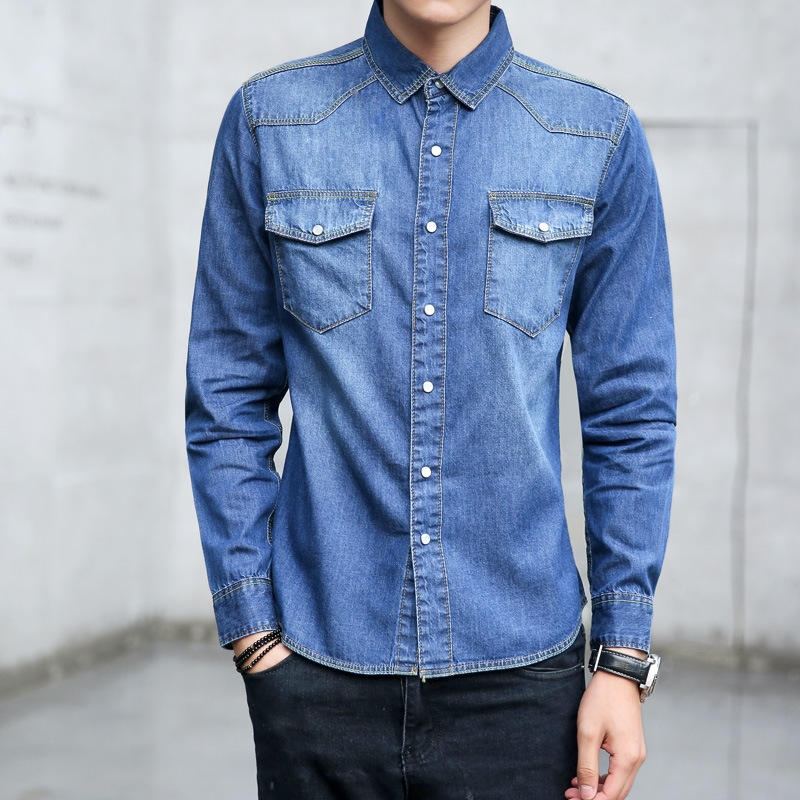 Custom Logo Cotton Denim Breathable Long Sleeve Washed Blue Men's Shirts Button Up Casual Fit