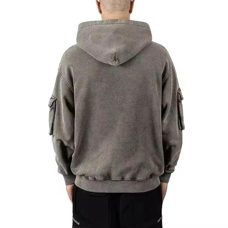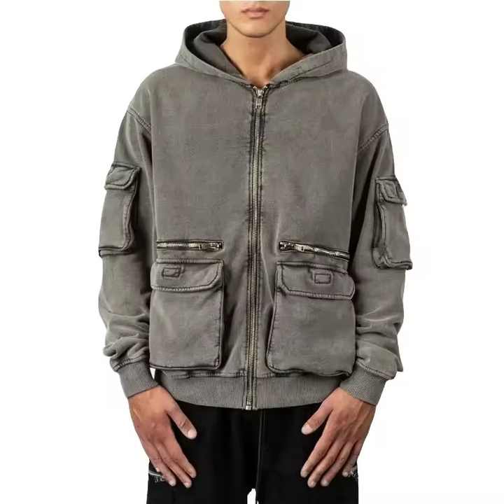 Custom Logo Cotton Heavyweight Hoodies Men's Cargo Track 3d Pockets oversized hoodies Vintage Stone Washed Zip Up Hoodies