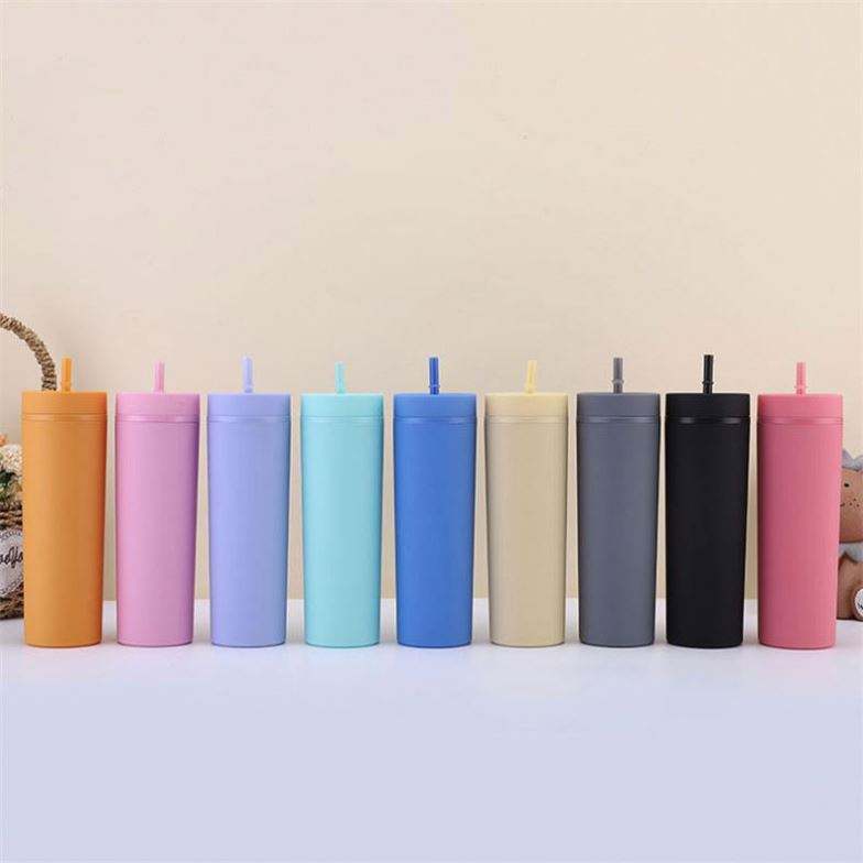 Custom Logo DIY 16Oz Double Wall Slim Acrylic Matte Tumblers Plastic Reusable Straight Skinny Tumbler Cups With Lid and Straw