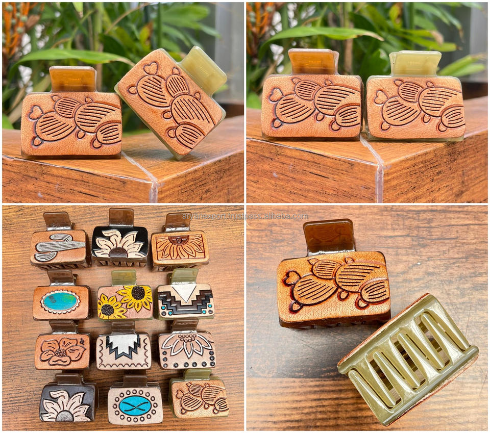 Custom Logo Desert Bloom Design Tooled Engraved Leather Mini Hair Clip for Women Personalized Strong Hold Luxury Hair Accessory