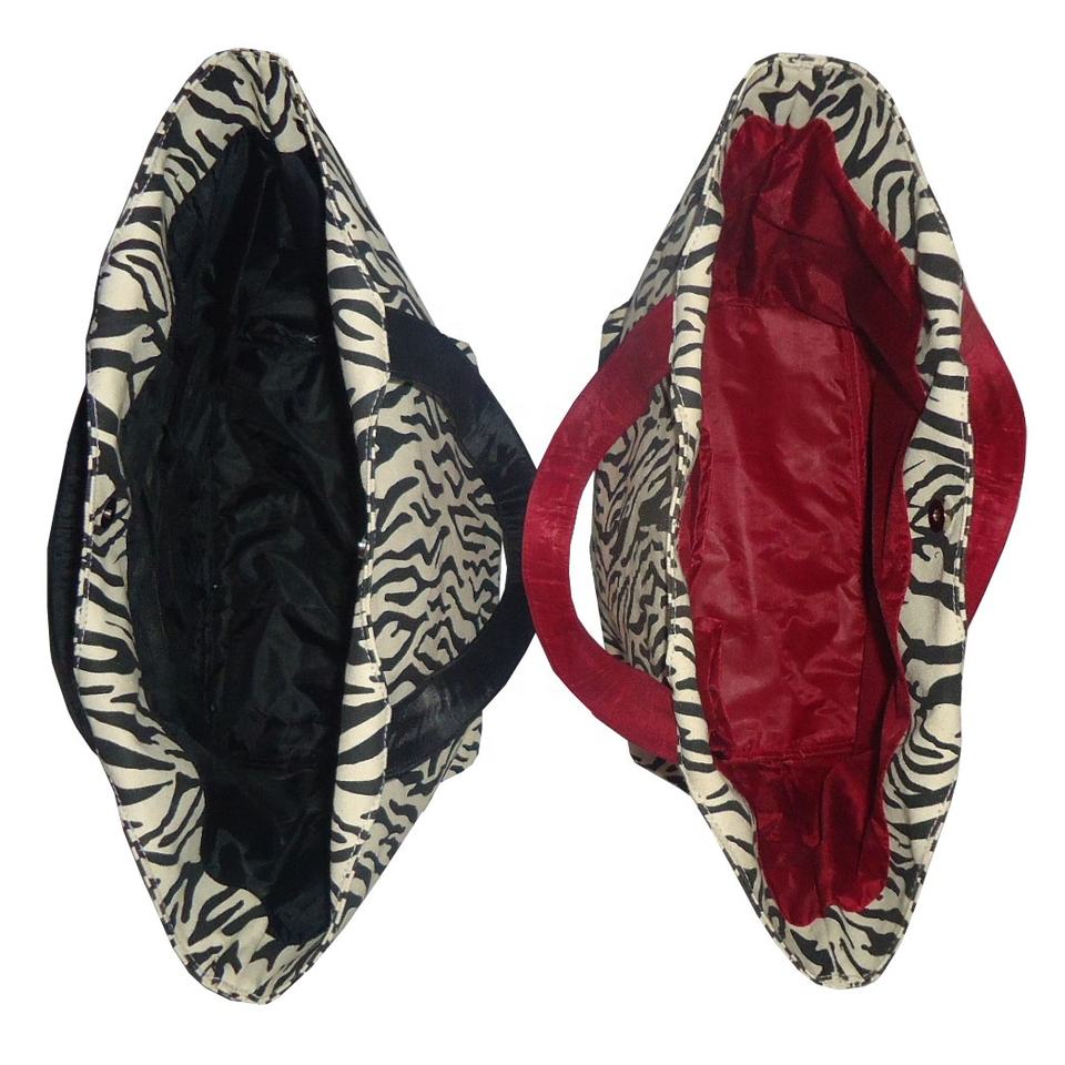 Custom Logo Eco-friendly Animal Prints Beach Tote Bag Genuine Leather Handle Allover Zebra Print Polyester Lined Magnet Closure