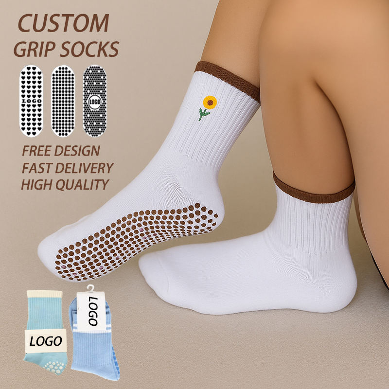 Custom Logo Embroidery Anti-slip Socks for Pilates Yoga Barre Workout Cotton Crew Grip Pilates Yoga Socks for Women