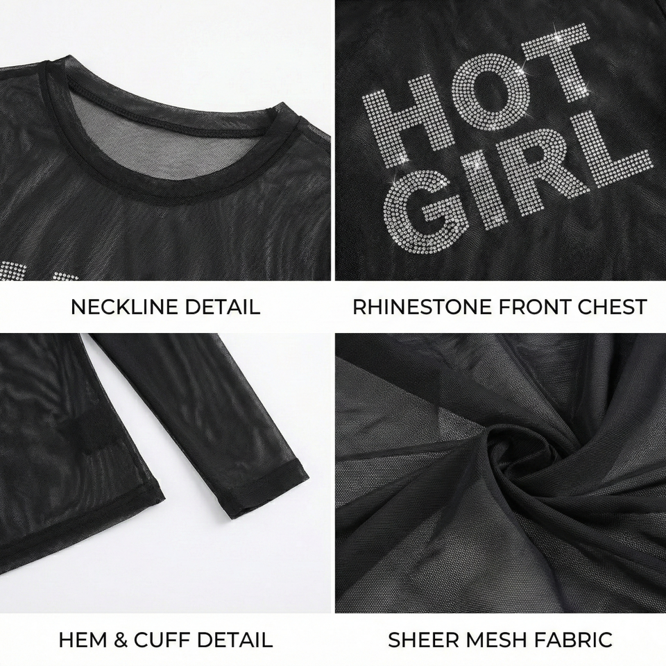 Custom Logo Fashion Sexy Mesh Black See Through Round Neck T-Shirt Low Cost Summer Rhinestone Long Sleeves Crew Neck Cropped Top