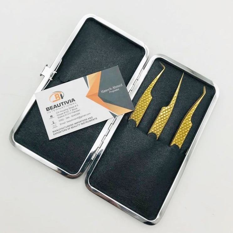 Custom Logo Gold-Plated Stainless Steel Eyelash Extension Tweezers Diamond Grip Pointed Tip Magnetic Case Professional Tool