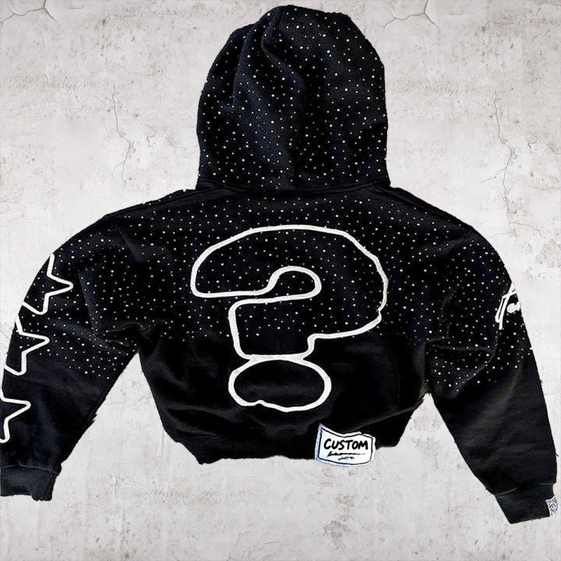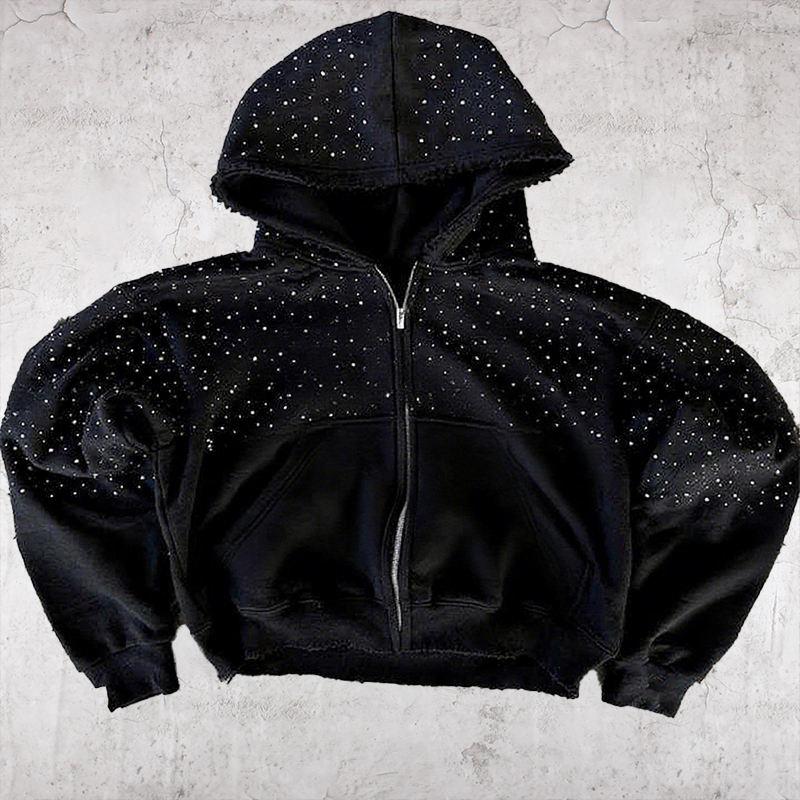 Custom Logo High Quality Streetwear 100% Cotton Heavy Weight Oversized Distressed Boxy Zip Rhinestone Screen Printing Winter