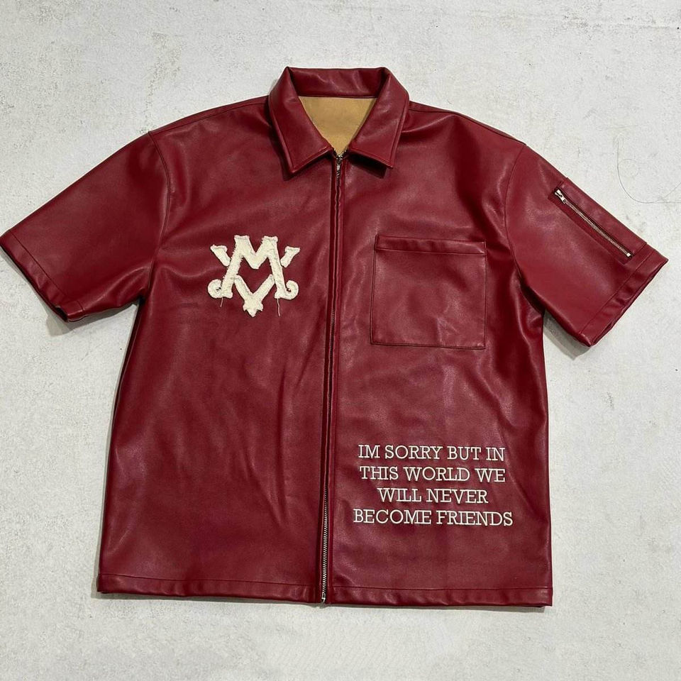 Custom Logo High Quality Streetwear Design Mens Short Sleeve Leather Shirts Hip Hop Zip up Streetwear Drop Shoulder T-shirts