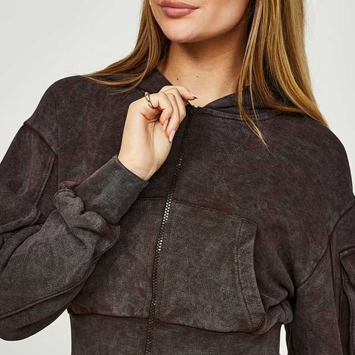 Custom Logo High Quality Women Sweat Suit Zip up Hoodie and Jogger Set Top Plain Fleece Heavyweight Cropped Tracksuit