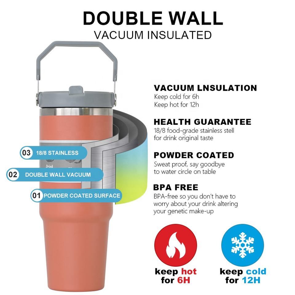 Custom Logo Insulated Stainless Steel Double Walled Vacuum Water Bottle 20oz 30 Oz Tumbler With Handle And Straw Lid