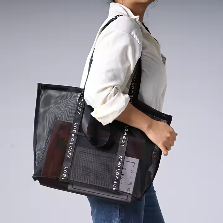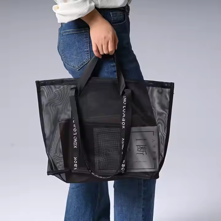 Custom Logo Large Capacity Nylon Mesh Shopping Bag Fashion Black Net Fruit Vegetable Carrying Tote Letter Shoulder Shopping Bag