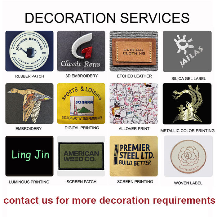 Silk Screen Printing, Heat-Transfer Printing, Maching embroidery, Hand Embroidery, Affixed cloth embroidery, sequin embroidery, 3D embroidery, Nail bead embroidery, Flocking embroideryTechnics