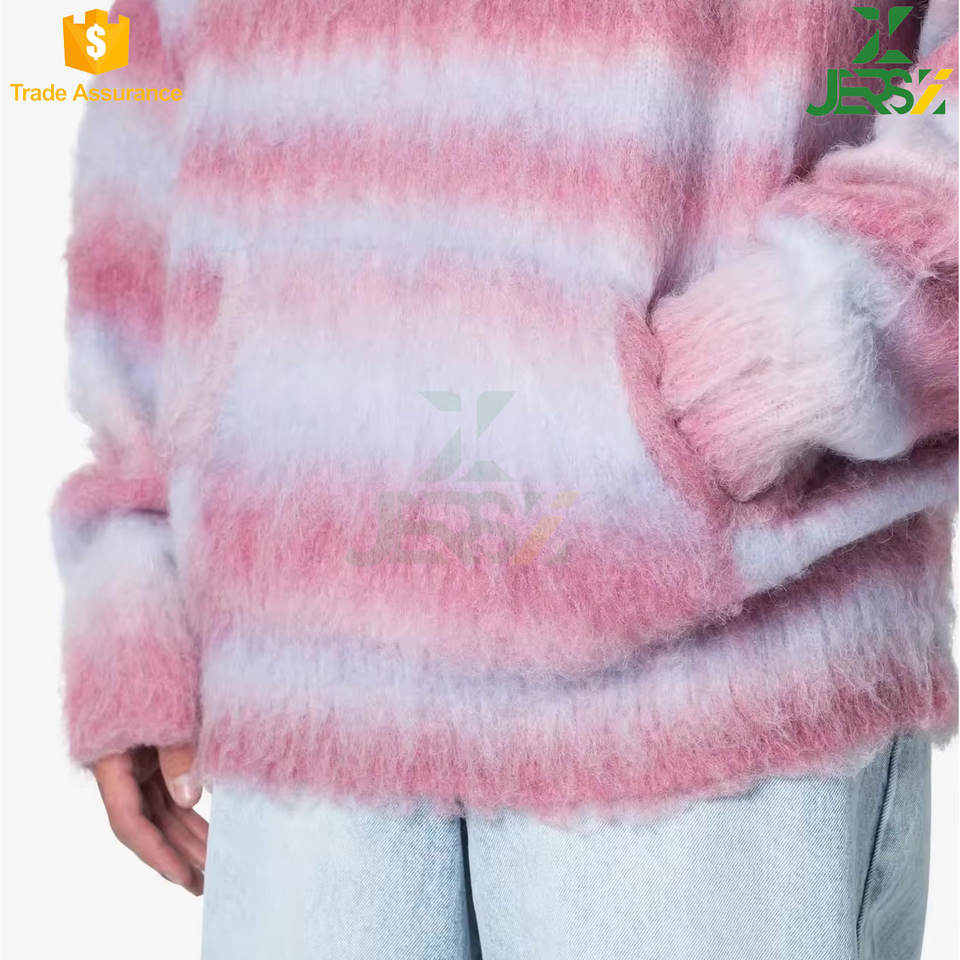 Custom Logo Long Sleeve Mohair Men's Sweater Fuzzy Knitted Striped Hooded Casual Knitwear Winter Customized Color & Size