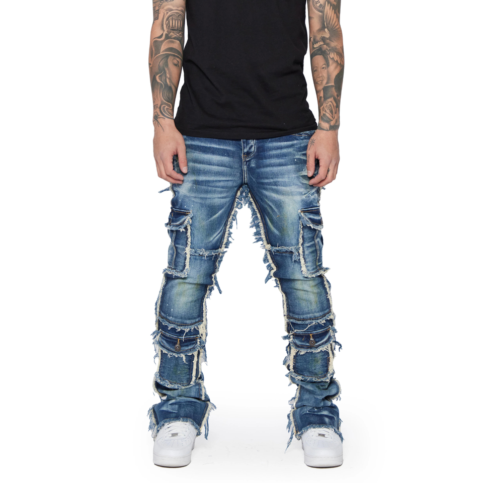 Custom Logo Men's Denim Jeans High Street Hip Hop Heavy Washed Cargo Pant Breathable Crystal Embroidery Button Stacked Denim