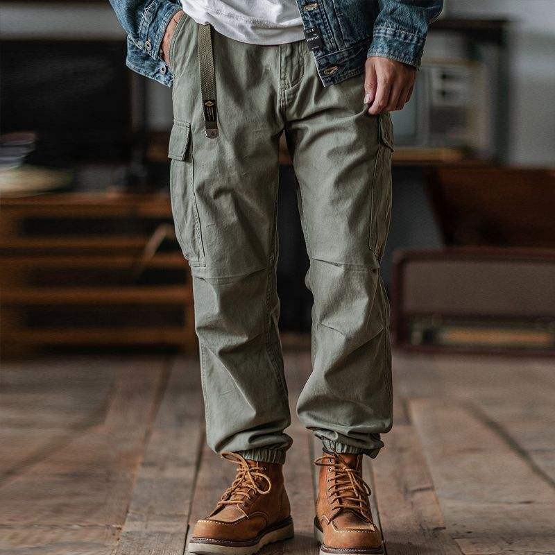 Custom Logo Men's Hiking Pants High Quality Multi-Pocket Ankle Tied Tactical Cargo Trousers 100% Cotton Solid Drawstring Flat