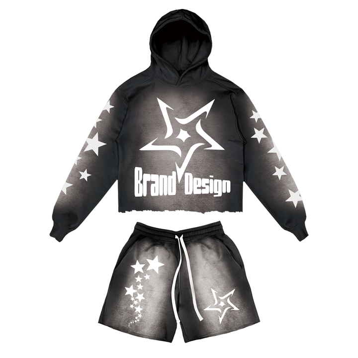 Custom Logo Men's Sets Sun Faded Raw Hem Two Piece Sweat Jogger Acid Wash Hoodies and Shorts Set for Men