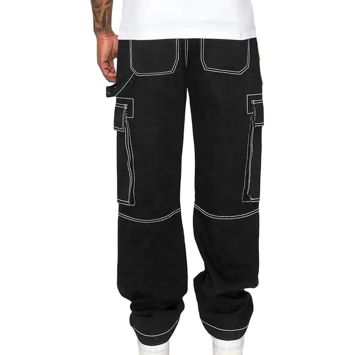 Custom Logo Men's Straight Flare Jeans Coated Outdoor Denim Cargo Pants with Multi-Pockets and Embroidery Loose Cargo Style