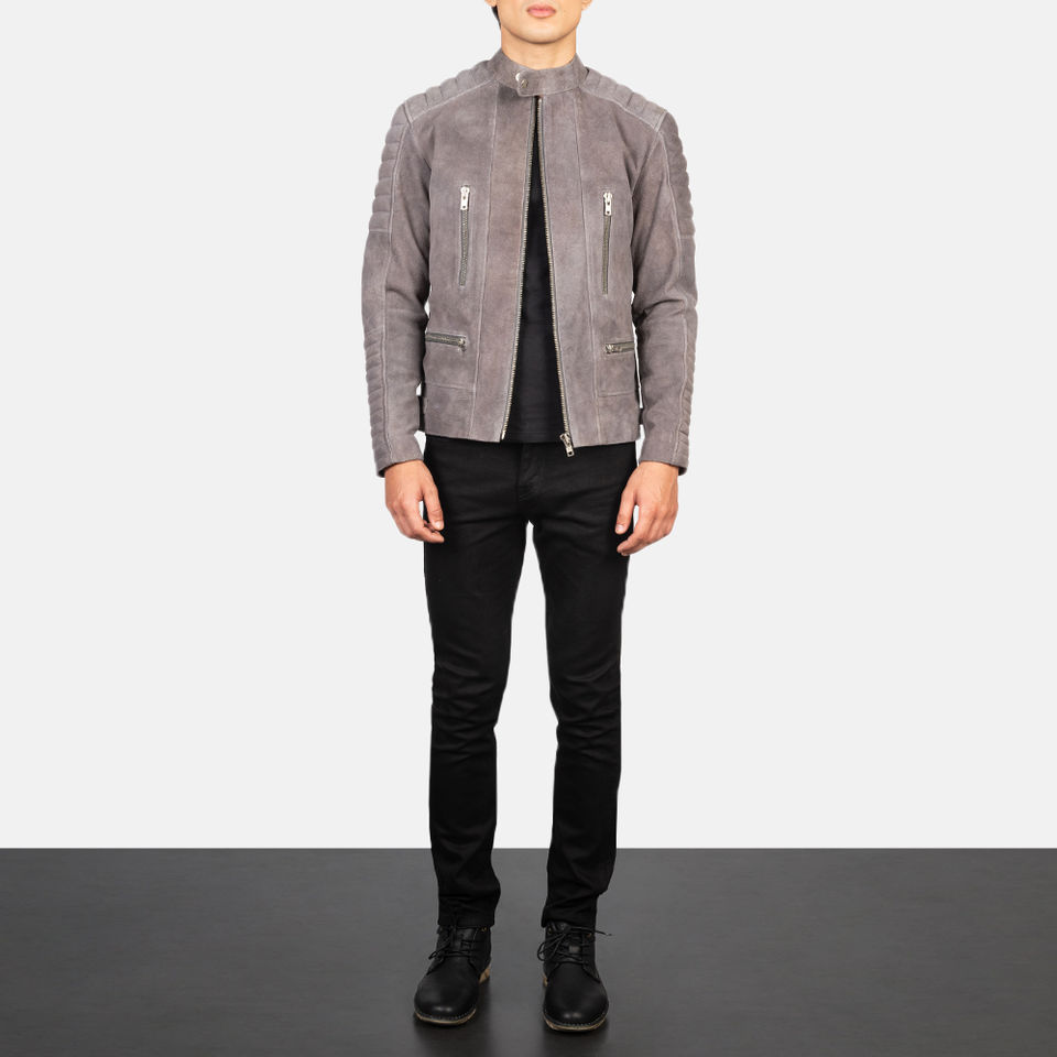 Custom Logo Mens Biker Genuine Cowhide Embossed Leather Suede Stand Collar Bomber Jacket with Front Logo