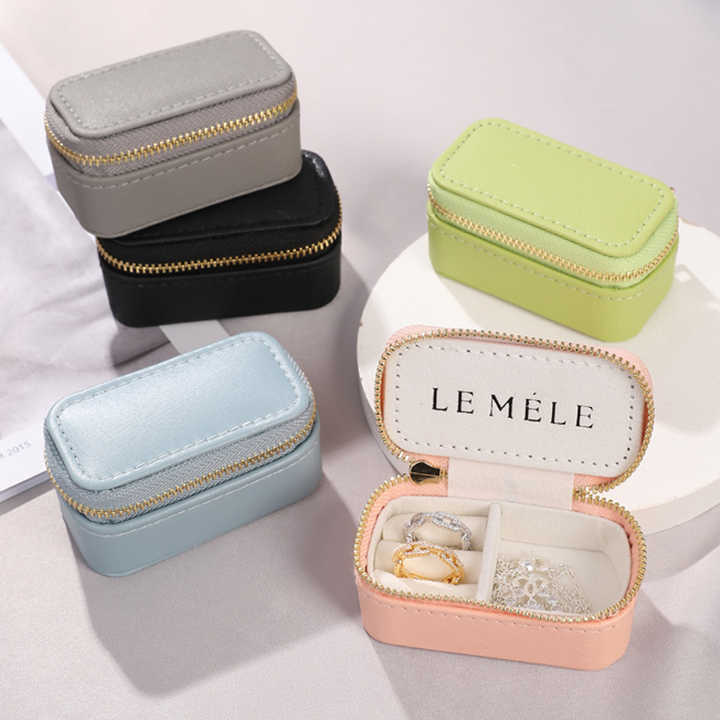 Custom Logo Mini Portable Earrings Ring Zipper Leather Travel Jewelry Storage Case Packaging Small Leather Jewelry Box