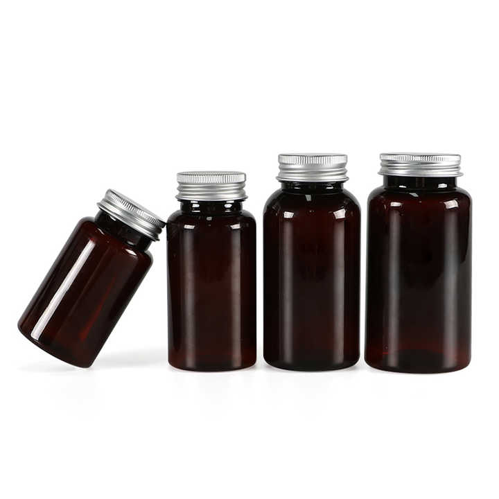 Custom Logo PET Round Bottle 120ml 250ml Transparent Brown with Gold Stamping Aluminum Lids for Magnesium Pills