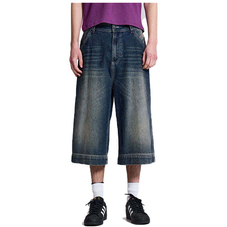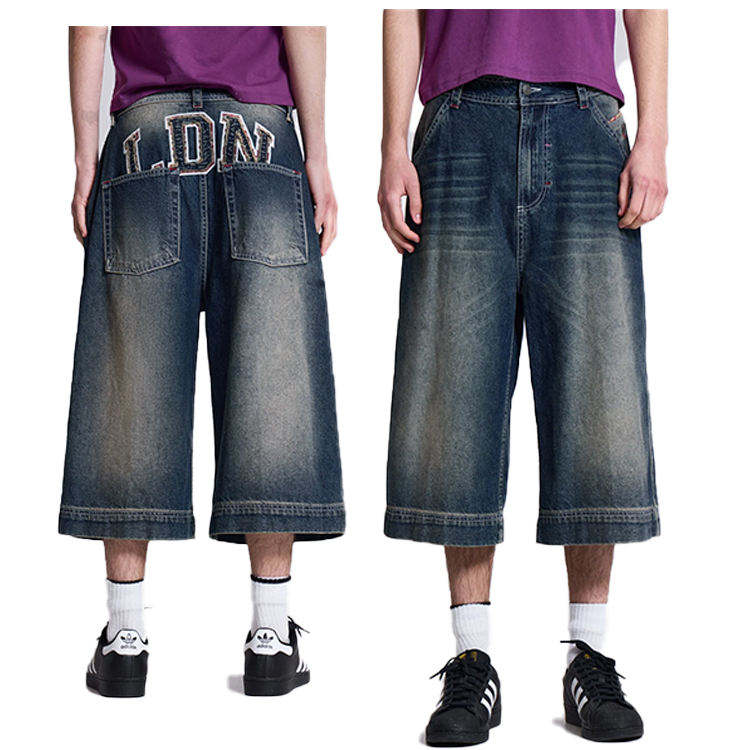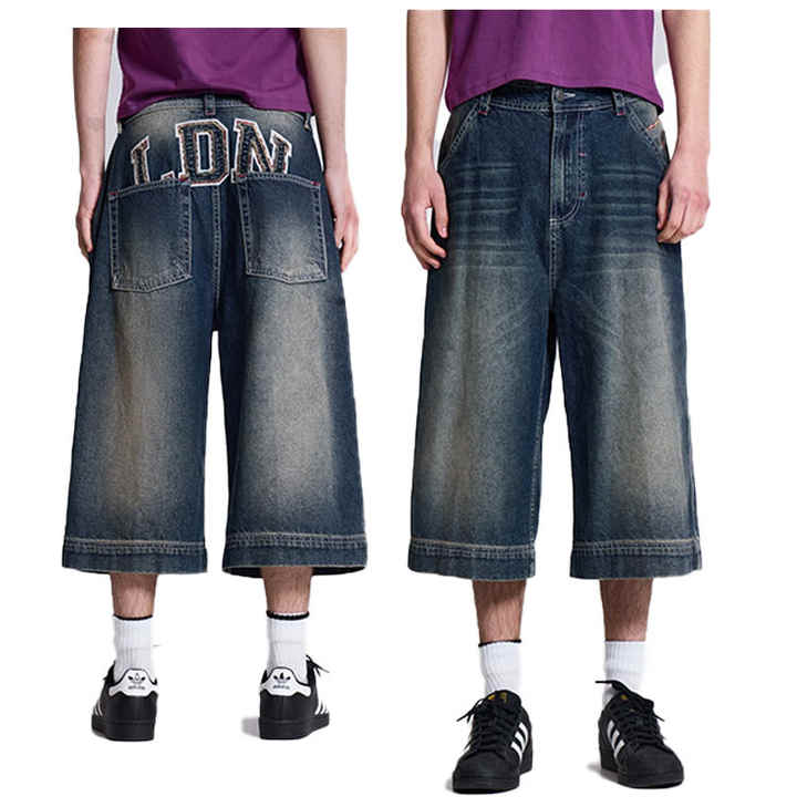 Custom Logo Patch Embroidered Men Jeans Shorts Acid Wash 100% Cotton Jorts Baggy Street Skating Loose Dark Blue Denim Shorts Men