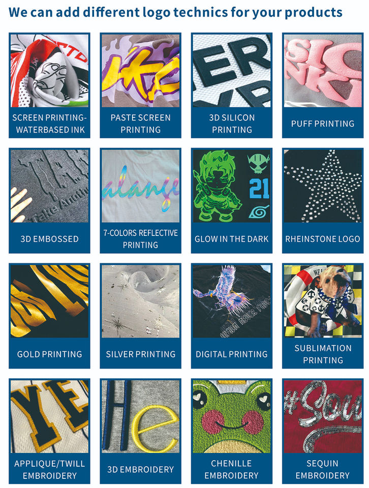 Discharge Printing, Tie-dye, Puff Printing, Embossed, Heat-Transfer Printing, Digital Printing, Spray printing, Silk Screen Printing, Sublimation Transfer Print