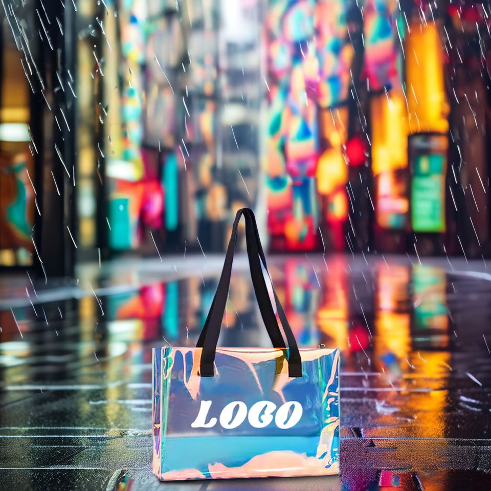 Custom Logo Pvc Plastic Shopping Bag Holographic Rainbow Iridescent Handbag Waterproof Tote Bags for Women