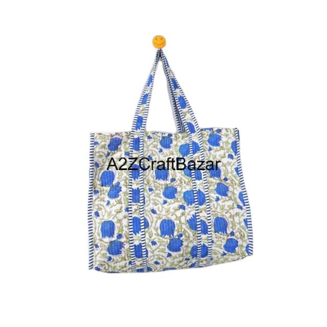 Custom Logo Quilted Cotton Tote Bag Handprinted Reversible Large Eco-Friendly Jhola Striped Pattern Daily Use Shopping Bag
