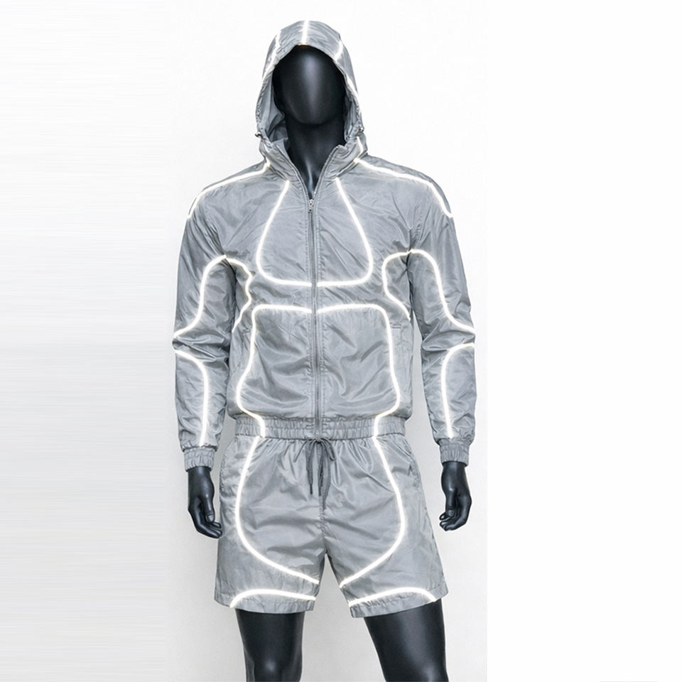 Custom Logo Reflective Patchwork Zip-Up Jacket 100% Cotton Breathable High Street Summer Windbreaker Unisex Men Sports Shorts