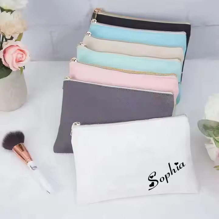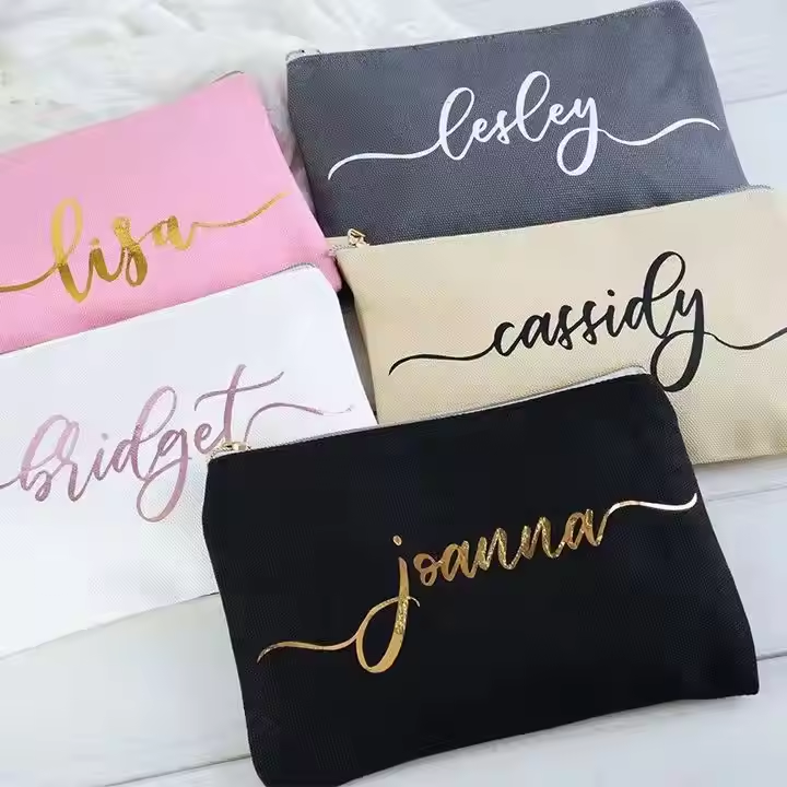 Custom Logo Rose Gold Foil White Grey Canvas Silk Screen Printed Cotton Makeup Pouch Bridesmaid Gift Cosmetic Bag