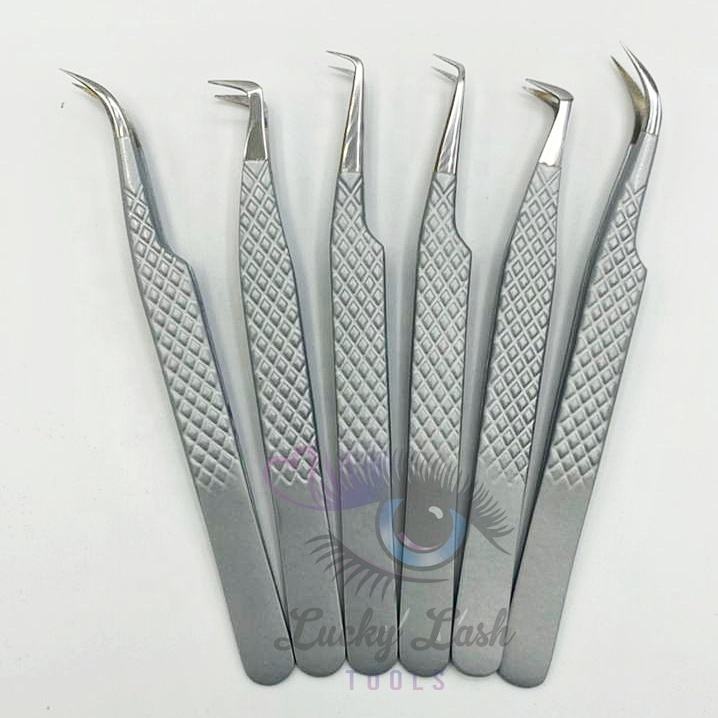 Custom Logo Sustainable Eyelash Extension Tweezers Set Gray Powder Coating Private Label Fiber Tip Different Tip Eyelash Tweezer