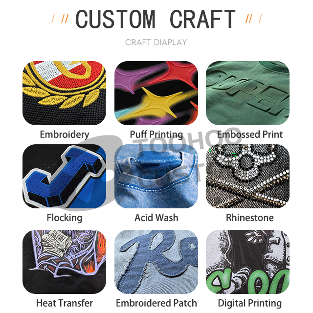 Embroidered, Printed, 3D embroidery, Flocking embroidery, sequin embroidery, Washed, Puff Print, Flocking, Rhinestone