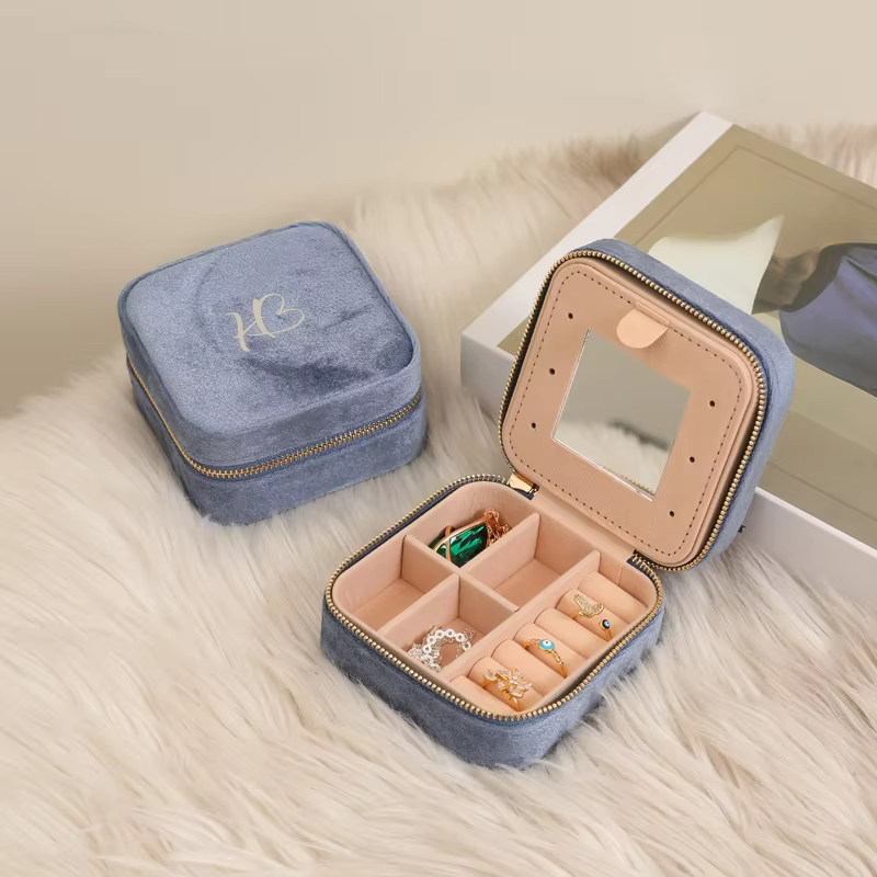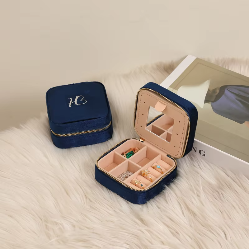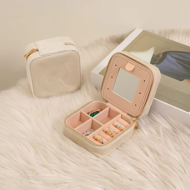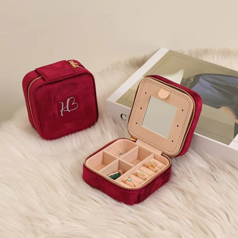 Custom Logo Velvet Square Mini Jewellery Storage Case-Portable PU Leather Travel Organizer for Necklaces & Earrings