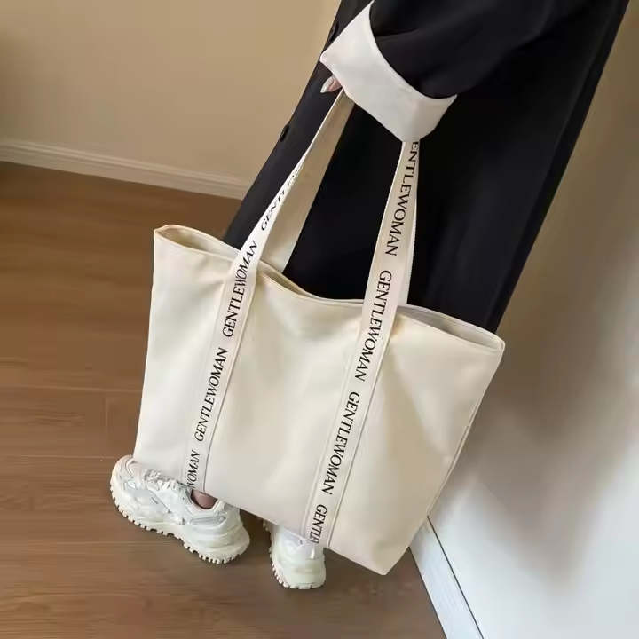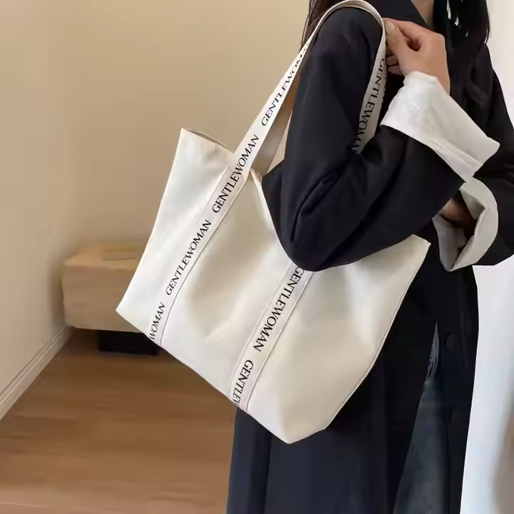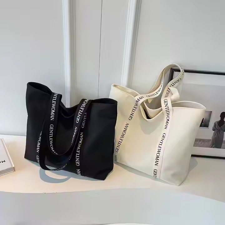 Custom Logo Weekender Canvas Cotton Shopping Tote Bag with Reinforced Letter Handle Black for Women and Men Gift