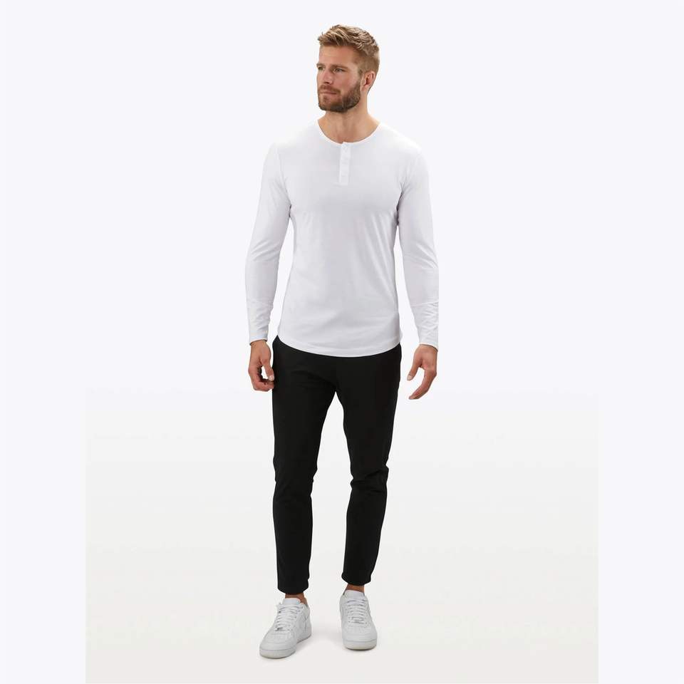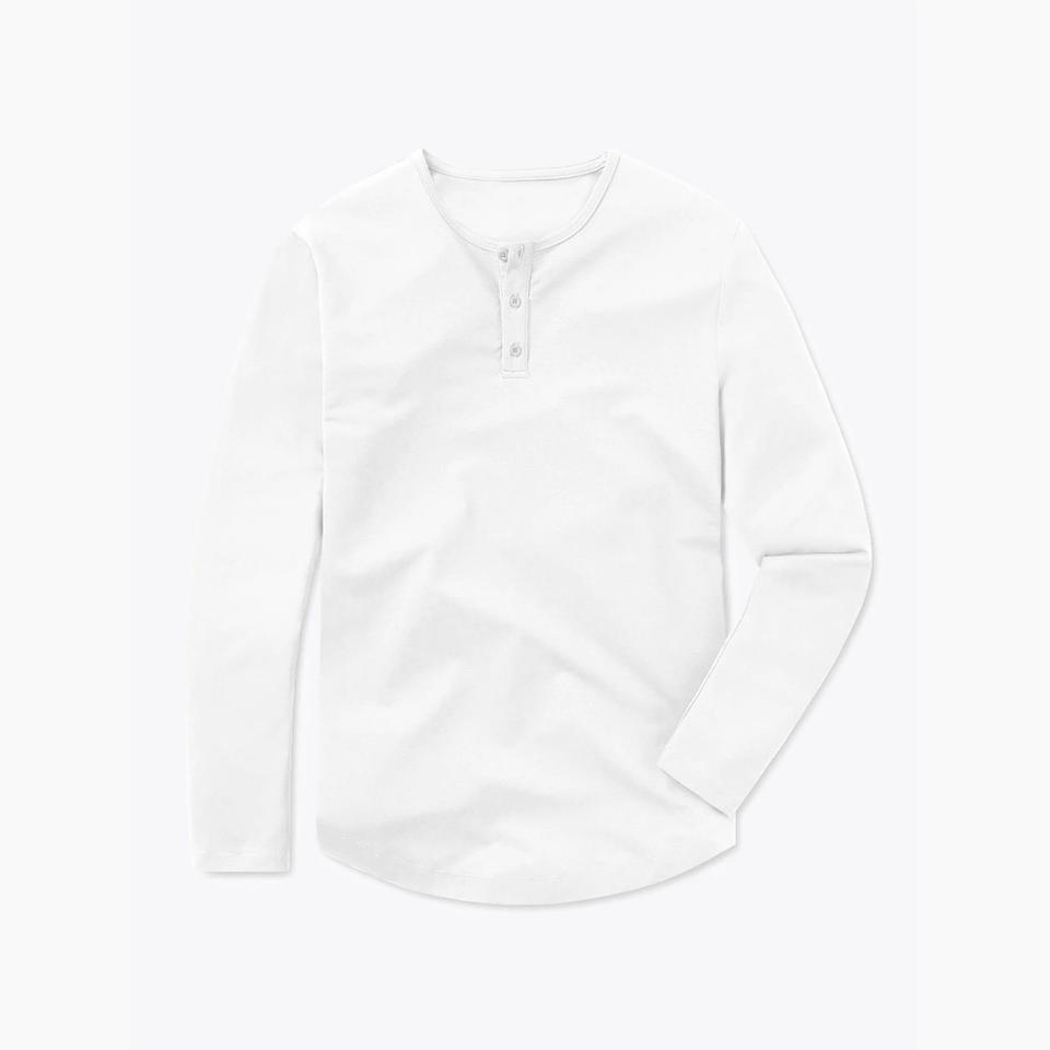 Custom Logo White Henley Shirt Buttery Soft, Signature Fit, Long Sleeves, Curve Hem 62% Polyester, 33% Cotton, 5% Spandex