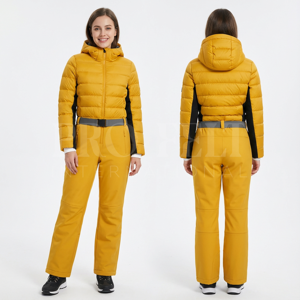 Custom Logo Wind Proof Quilted Down Snowsuit with Belt & Hood Hood Neck Ski Jumpsuit with Panel Design Sportswear Snowsuits