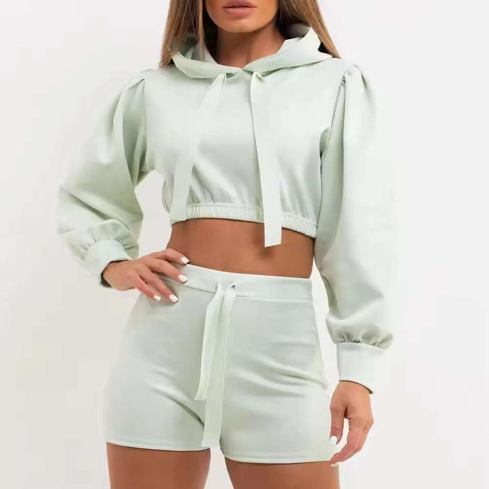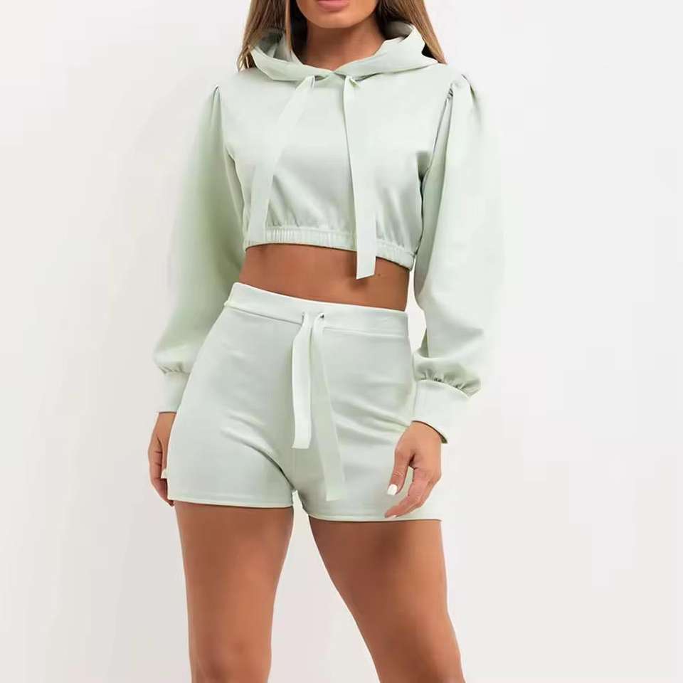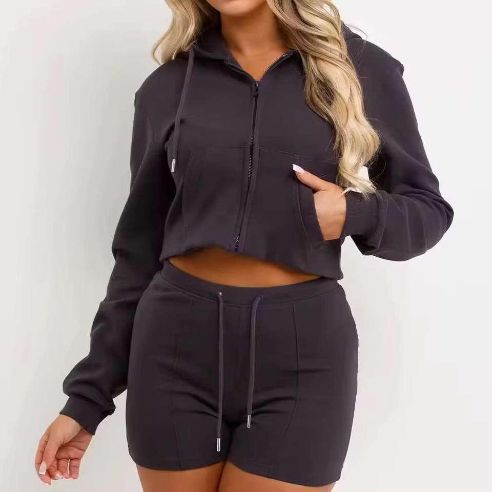 Custom Logo Winter Solid 100% Cotton Crop Top Hoodie Short Set Women Zipper Biker 2 Piece Jogger Set