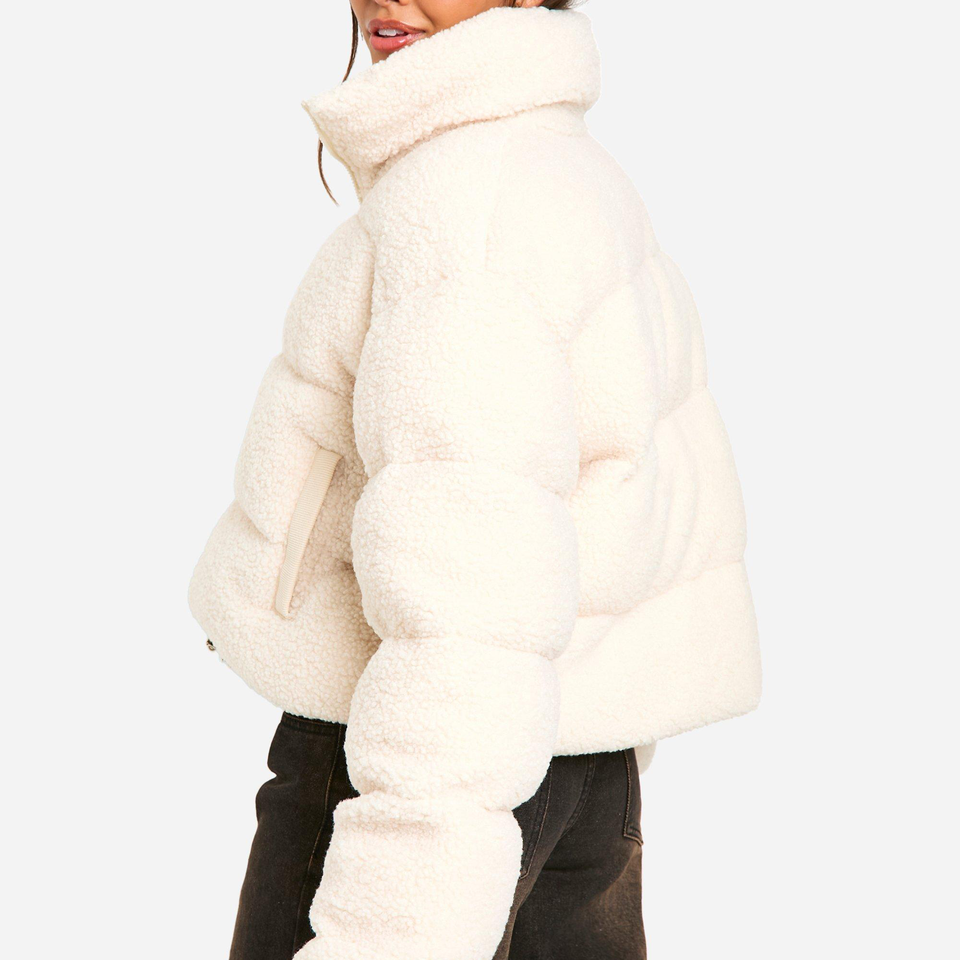 Custom Logo Women's Winter Sherpa Fleece Puffer Jacket Warm Oversized Hooded Coat Zipper Closure Cotton Rivet Embroidery