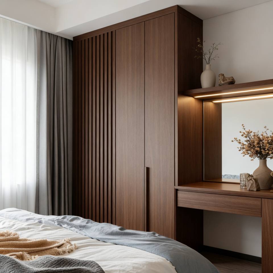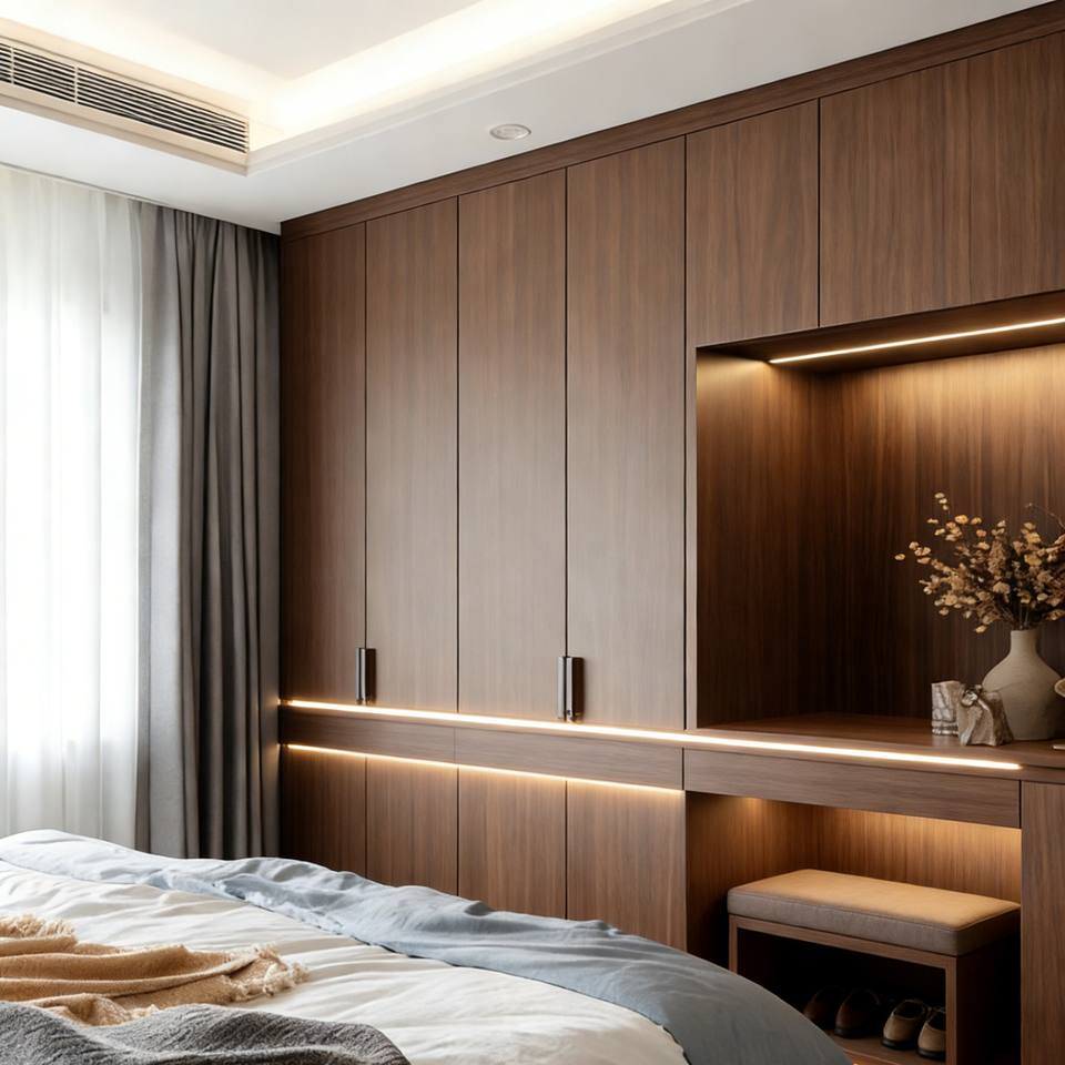 Custom Luxury Bedroom Wood Cabinet Integrated Walk-in Wardrobe with Glass Display Niche & Built-in Vanity Desk
