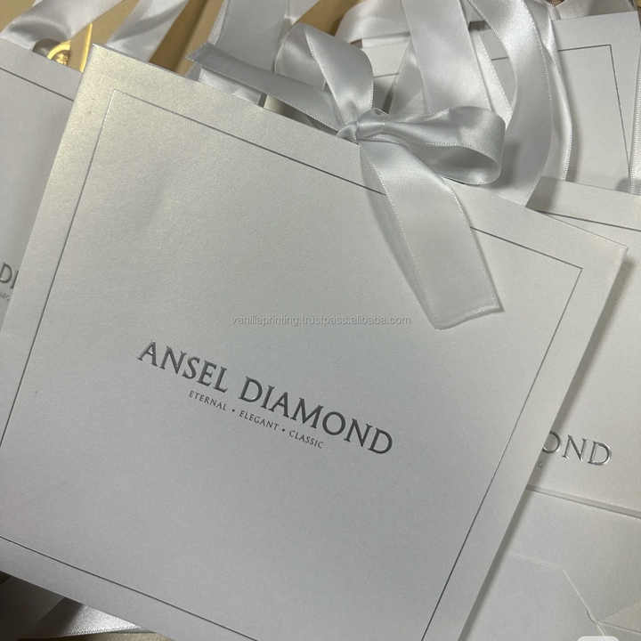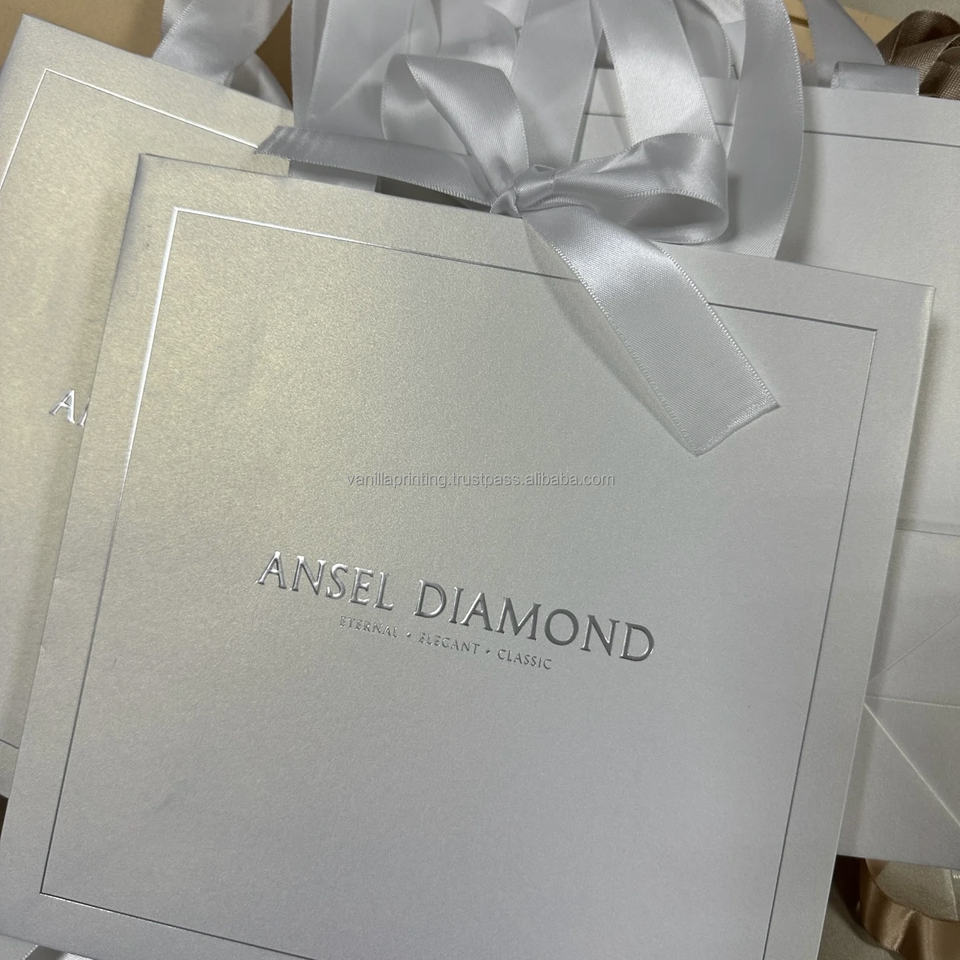 Custom Luxury Embossed Silver Foil Paper Bag with Ribbon Handle Logo Packaging for Cosmetics for Promotion and Shopping
