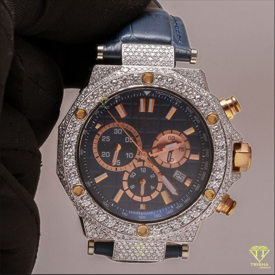 Custom Luxury Men's Stainless Steel Analog Dial Display Watch with 20mm Band Width Cut Moissanite Hip Hop Style Glass Window